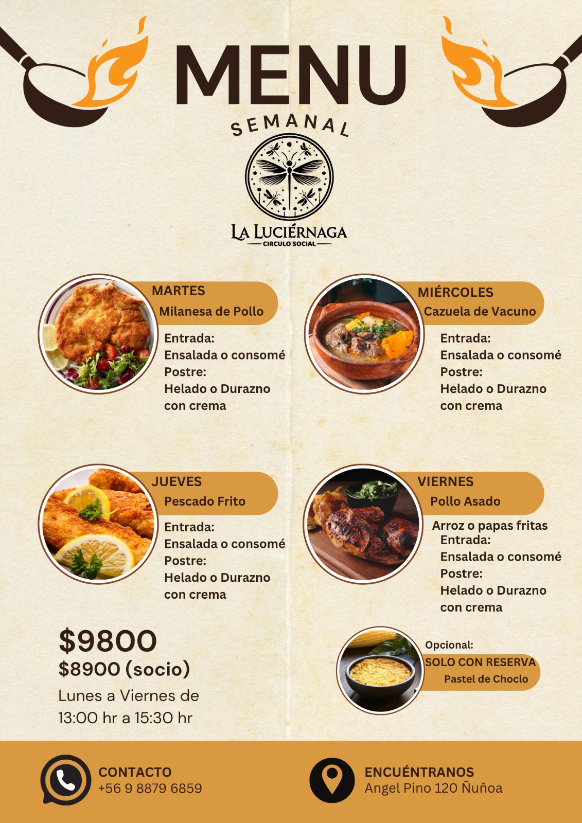 HORARIO: LUNES DE 10:30 A 13:50 HRS. MARTES A VIERNES DE 10:30 A 16:30 HRS. VALORES: SOCIO $6.000.- NO SOCIO $7.000.-